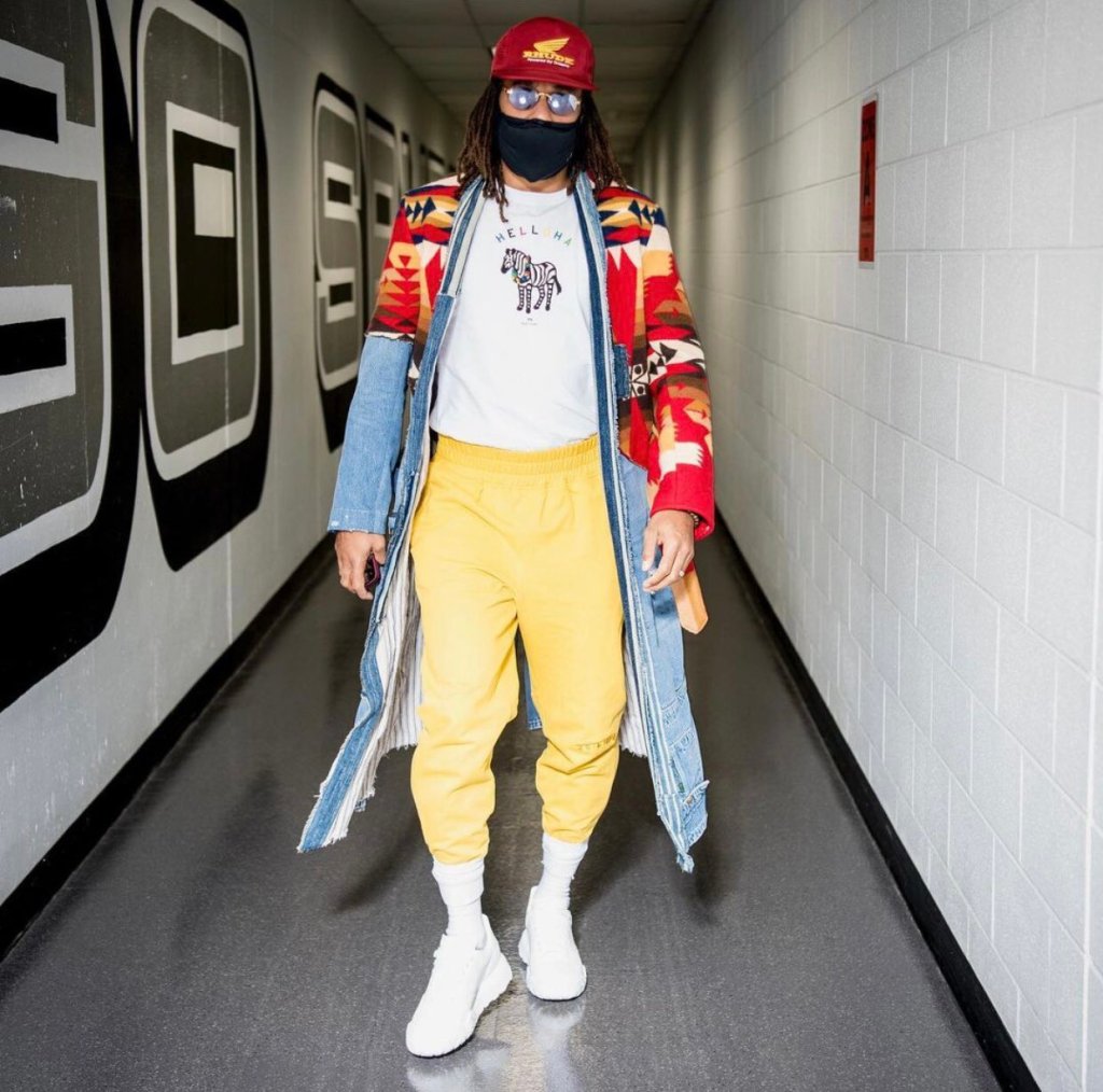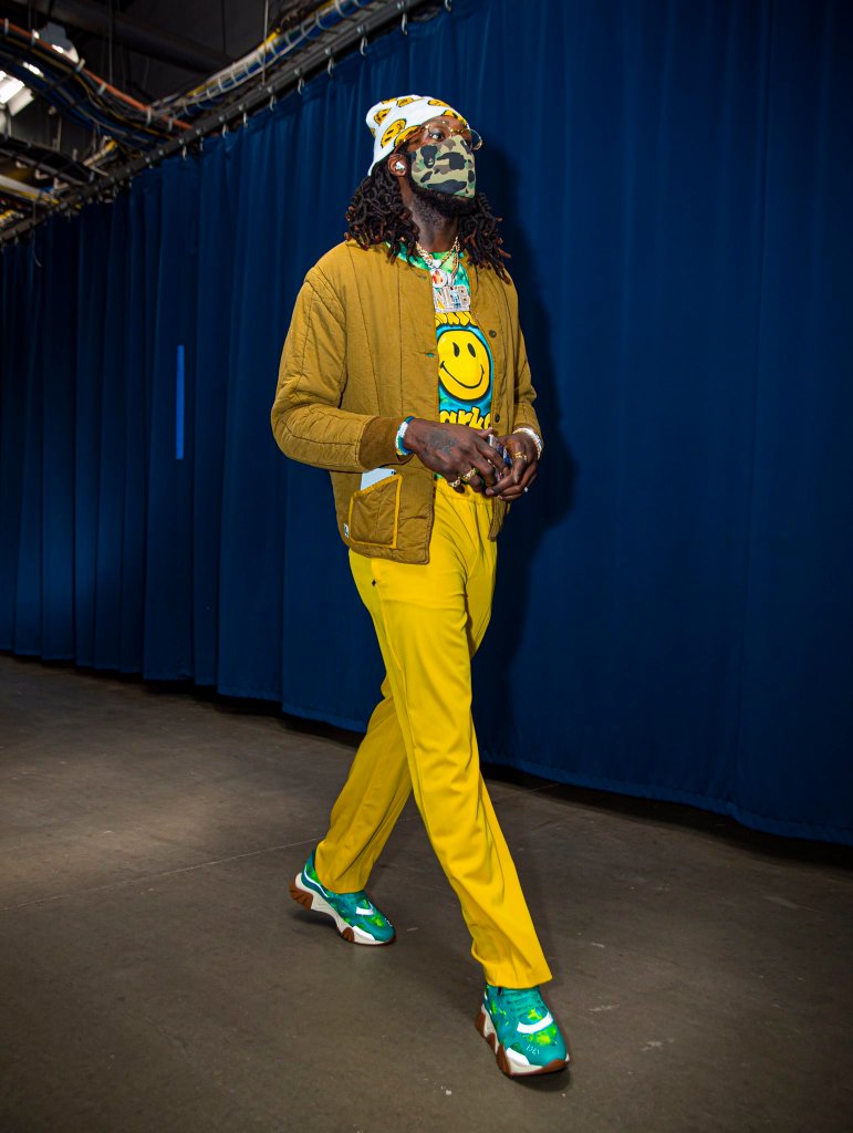 Montrezl Harrell – Trez took the smiley face drip next level with this fit. 2020’s Sixth Man of the Year looked nothing like a bench player as he beamed down the arena tunnel.