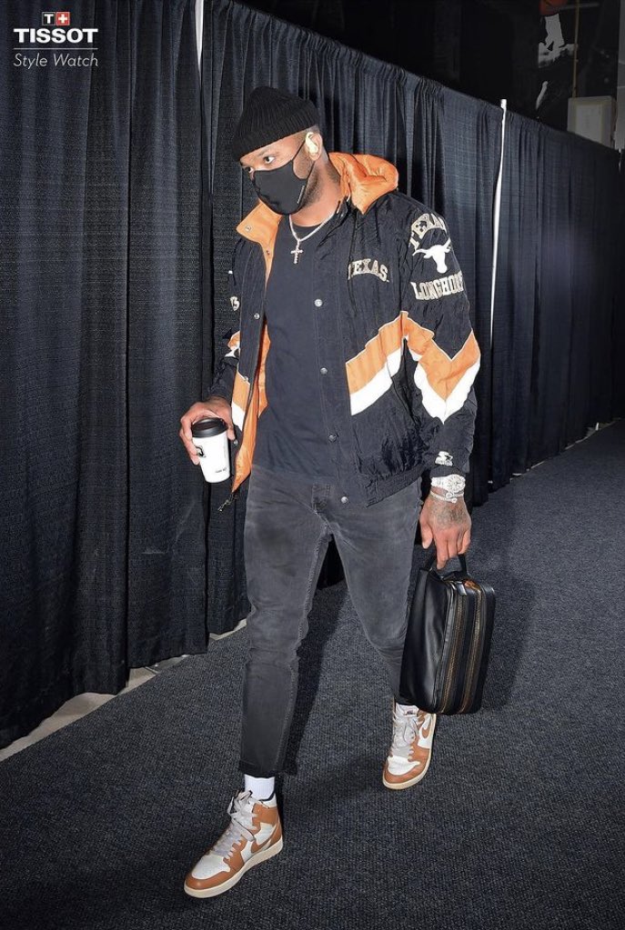 P.J. Tucker – The UT alum went full burnt orange featuring a very satisfying vintage Starter jacket and matching Jordans. Hook ‘em!